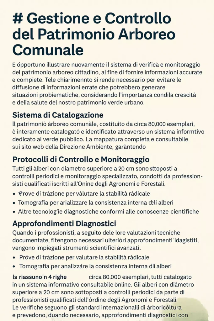 È opportuno illustrare nuovamente il sistema di verifica e monitoraggio del patrimonio arboreo cittadino, al fine di fornire informazioni accurate e complete. Tale chiarimento si rende necessario per evitare la diffusione di informazioni errate che potrebbero generare situazioni problematiche, considerando l’importanza condivisa della crescita e della salute del nostro patrimonio verde urbano.