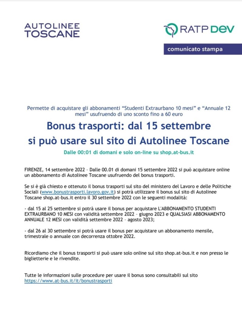 FIRENZE, 14 settembre 2022 Dalle 00.01 di domani 15 settembre 2022 si può acquistare online un abbonamento di Autolinee Toscane usufruendo del bonus trasporti.