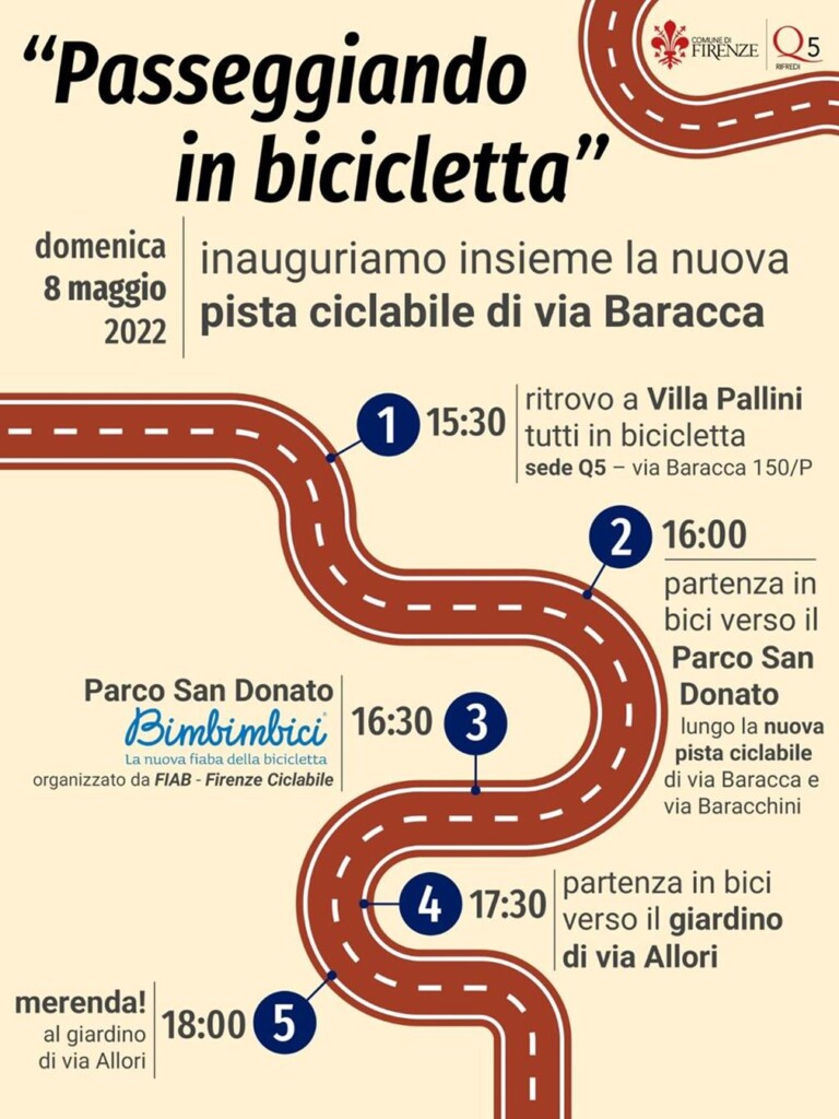 Si parte in bici dalla sede del Quartiere 5 (villa Pallini via Baracca , 150p ) fino al Parco San Donato dove FIAB Firenze Ciclabile organizza Bimbimbici: la nuova fiaba della bicicletta: da lì percorreremo la pista ciclabile in direzione opposta per terminare con la merenda al giardino di via Allori.
