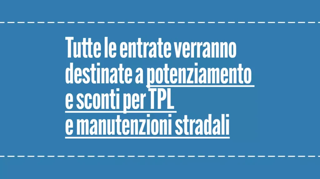 Tutte le entrate saranno destinate al potenziamento e sconti per TPL e manutenzione stradale.