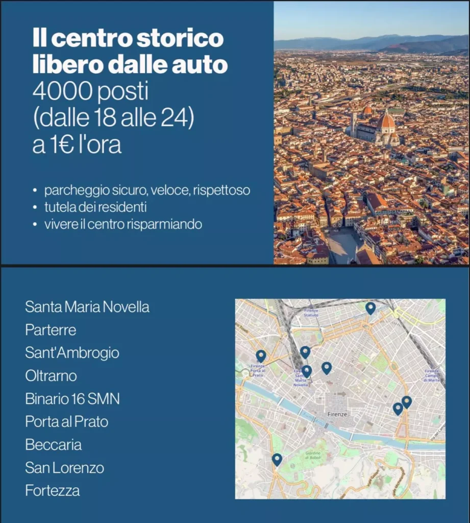 A partire dal 1° febbraio, tutti potranno parcheggiare nei principali parcheggi di struttura della città a una tariffa di 1 euro l’ora dalle 18 alle 24. I posteggi coinvolti nel piano sono Santa Maria Novella, Parterre, Sant’Ambrogio, Oltrarno, Binario 16 SMN, Porta a Prato, Beccaria, San Lorenzo e Fortezza, per un totale di circa 4.000 posti disponibili.